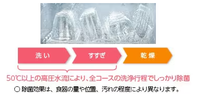 洗浄行程で、除菌が完了するストリーム除菌洗浄。清潔な食器洗いが簡単に。