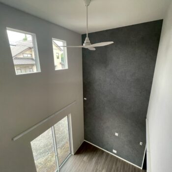吹き抜けが広がるリビングには、光と空気がめぐり、家全体に伸びやかな開放感をもたらします。